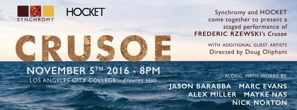 On November 5, Los Angeles Composers Collective Synchromy and experimental piano duo HOCKET join forces, along with twelve or so of their best friends, to present a staged version of Frederic Rzewski's rarely performed Crusoe.